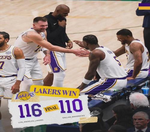 全场结束,湖人116-110击败独行侠,末节15分大逆转。看台上的球迷对东契奇举着标语:Come Home(回家吧)!东契奇自费购买22张包厢球票,请达拉斯球迷现场观战。东契奇33分8板11助、詹姆斯和八村塁各砍17分8板。