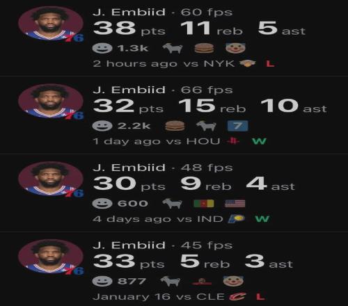 恩比德近期的状态不可阻挡,已连续四场得分30+,分别轰下33分、30分、32分和38分,梦回自己的MVP(22-23赛季)时期。