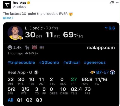 东契奇打到22分钟的时候已经得到30分11篮板12助攻,据统计,这是NBA历史最快的得分30+三双。此外,东契奇职业生涯第53次打出30+三双排名NBA历史第二。奥斯卡·罗伯逊以106次30+三双排名第一,约基奇51次30+三双第三,威少48次30+三双第四,詹姆斯42次30+三双第五。